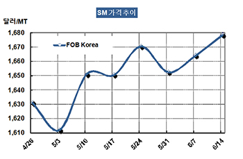 SM 가격은 6월14일 FOB Korea 톤당 1679달러로 15달러 상승했다.
