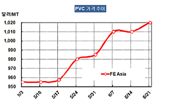 PVC 가격은 6월19일 CFR China 톤당 1020달러로 10달러 상승했다.