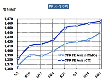 PP 가격은 6월19일 CFR FE Asia 톤당 1440달러로 25달러 급등했다.