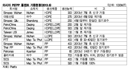 표, 그래프: <아시아 PE/PP 플랜트 가동현황(2013.6)> <화학저널 2013/06/25> |