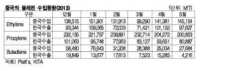 표, 그래프: <중국의 올레핀 수입동향(2013)>