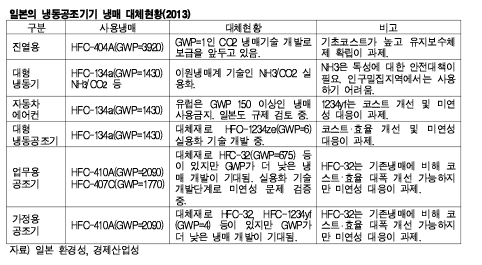표, 그래프: <일본의 냉동공조기기 냉매 대체현황(2013)> <화학저널 2013/07/10> |