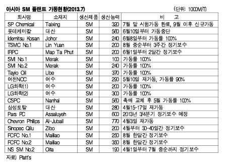 표, 그래프: <아시아 SM 플랜트 가동현황(2013.7) > <화학저널 2013/07/10> |