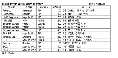 표, 그래프: <아시아 PE/PP 플랜트 가동현황(2013.7)> <화학저널 2013/07/12> |