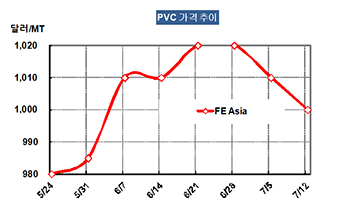 PVC 가격은 7월10일 CFR China 톤당 1000달러로 10달러 하락했다. 중국은 수요가 약세를 지속하고 있음에도 불구하고 원료인 에틸렌(Ethylene) 강세와 생산기업들이 가동률을 의도적으로 감축해 상승한 것으로 나타났다. 표, 그래프: < PVC 가격추이 > <화학저널 2013/07/16> |