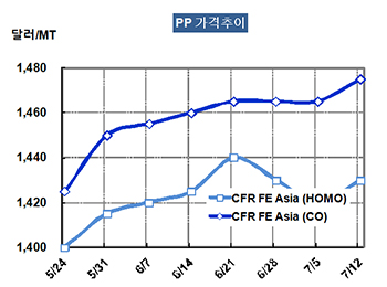 PP 가격은 7월10일 CFR FE Asia 톤당 1430달러로 10달러 상승했다.