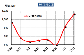 MEG 가격은 7월12일 CFR China 톤당 1013달러로 30달러 상승했다.