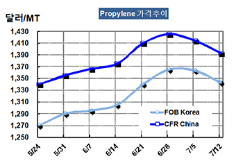 프로필렌 가격은 7월12일 FOB Korea 톤당 1343달러로 20달러 하락했다.