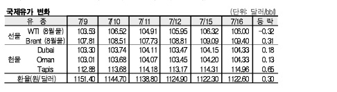 7월16일 국제유가는 브렌트유가 미국 휘발유 가격 급등으로 올랐으나 WTI는 미국 증시가 떨어져 하락했다.