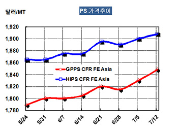GPPS 가격은 7월10일 CFR China 톤당 1848달러로 18달러 상승했다.