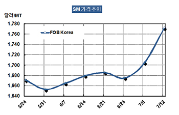 SM 가격은 7월12일 FOB Korea 톤당 1771달러로 67달러 폭등했다.
