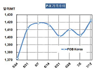 P-X 가격은 7월12일 FOB Korea 톤당 1423달러로 11달러 하락했다.