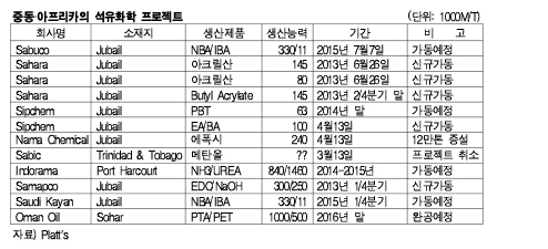 표, 그래프: < 중동·아프리카의 석유화학 프로젝트 > <화학저널 2013/07/19> |