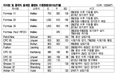표, 그래프: < 타이완 및 중국의 올레핀 플랜트 가동현황(2013년7월) > <화학저널 2013/07/19> |