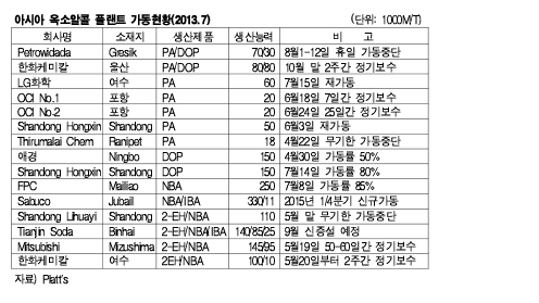 표, 그래프: < 아시아 옥소알콜 플랜트 가동현황(2013.7) > <화학저널 2013/07/24> |