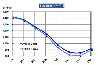 부타디엔 가격은 7월26일 FOB Korea 톤당 900달러로 85달러 폭등했다.