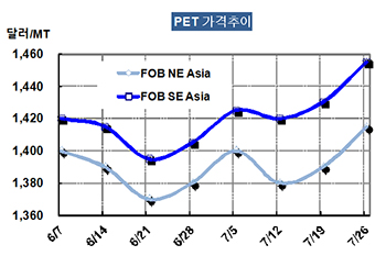 아시아 PET(Polyethylene Terephthalate) 시장은 원료가격이 강세를 나타내면서 상승세로 전환됐다.