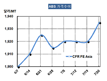 ABS 가격은 7월24일 CFR China 톤당 1935달러로 15달러 상승했다.