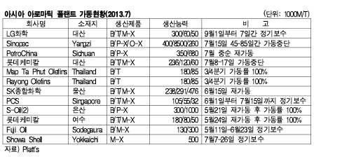 표, 그래프: < 아시아 아로마틱 플랜트 가동현황(2013.7) > <화학저널 2013/07/30> |