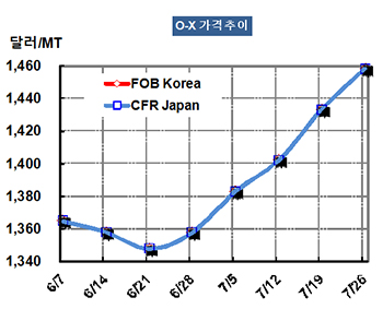 O-X 가격은 7월26일 FOB Korea 톤당 1458달러로 25달러 상승했다.