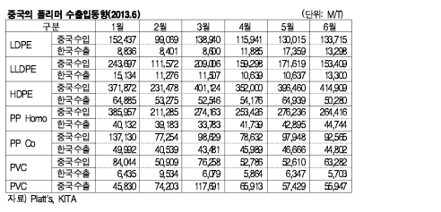 표, 그래프: < 중국의 폴리머 수출입동향(2013.6) > <화학저널 2013/07/30> |