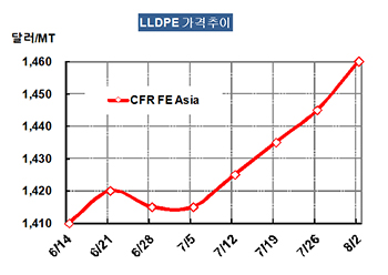 LLDPE 가격은 7월31일 CFR FE Asia 톤당 1460달러로 15달러 상승했다.