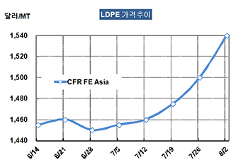 LDPE 가격은 7월31일 CFR FE Asia 톤당 1540달러로 40달러 폭등했다.