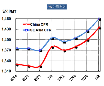 PA 가격은 8월2일 CFR China 톤당 1435달러로 35달러 급등했다.