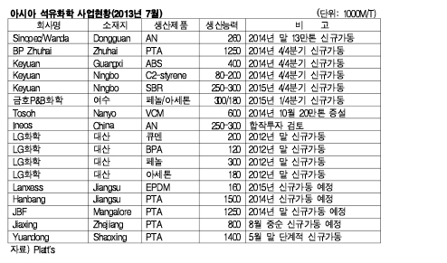 표, 그래프: < 아시아 석유화학 사업현황(2013년 7월) > <화학저널 2013/08/09> |