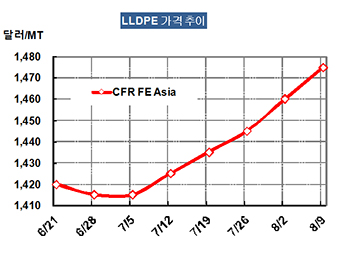 LLDPE 가격은 8월7일 CFR FE Asia 톤당 1475달러로 15달러 상승했다.