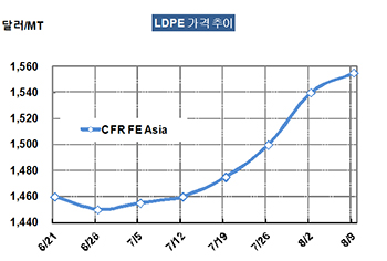 LDPE 가격은 8월7일 CFR FE Asia 톤당 1555달러로 15달러 상승했다.