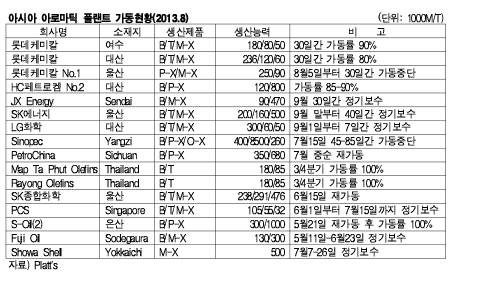 표, 그래프: < 아시아 아로마틱 플랜트 가동현황(2013.8) > <화학저널 2013/08/12> |