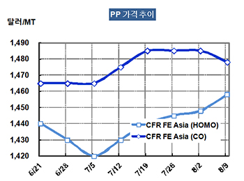 PP 가격은 8월7일 CFR FE Asia 톤당 1458달러로 10달러 상승했다.