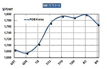 SM 가격은 8월9일 FOB Korea 톤당 1767달러로 32달러 하락했다.