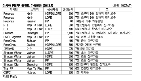 표, 그래프: <아시아 PE/PP 플랜트 가동현황 (2013.7) > <화학저널 2013/08/13> |