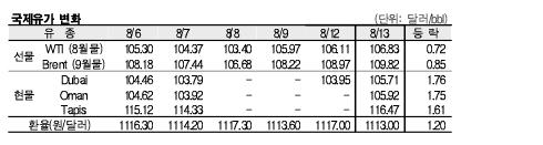 8월13일 국제유가는 주요국 경기지표 호조와 미국의 원유 재고 감소 예측 등으로 상승했다.