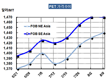 PET 가격은 8월7일 FOB NE Asia 톤당 1440달러로 10달러 상승했다.