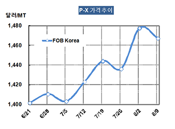 P-X 가격은 8월7일 FOB Korea 톤당 1467달러로 11달러 하락했다.