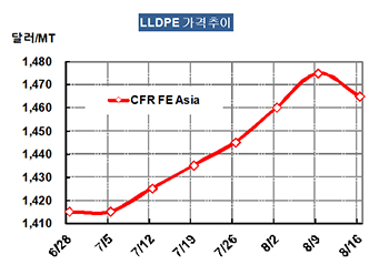 LLDPE 가격은 8월14일 CFR FE Asia 톤당 1465달러로 10달러 하락했다.