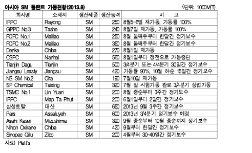 표, 그래프: <아시아 SM 플랜트 가동현황(2013.8) > <화학저널 2013/08/19> |