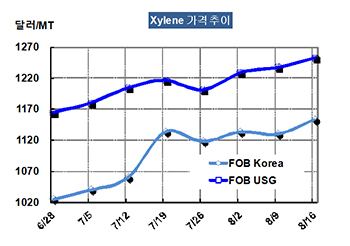M-X(Mixed-Xylene) 가격은 8월16일 FOB Korea 톤당 1153달러로 23달러 상승했다.