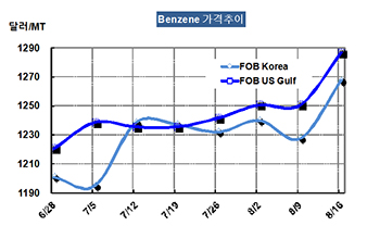 벤젠 가격은 8월16일 FOB Korea 톤당 1268달러로 40달러 급등했다.