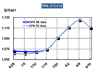 PTA 가격은 8월16일 CFR China 톤당 1115달러로 15달러 하락했다.