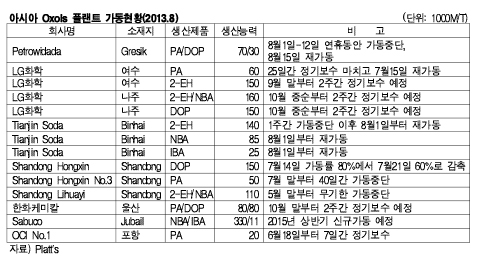 표, 그래프: < 아시아 Oxols 플랜트 가동현황(2013.8) > <화학저널 2013/08/22> |