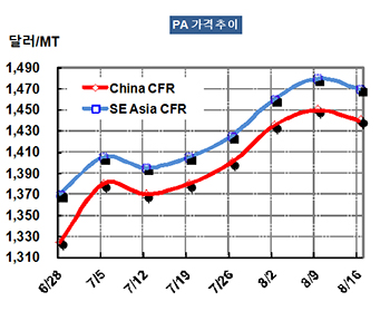 표, 그래프: < PA 가격추이 > <화학저널 2013/08/23> |