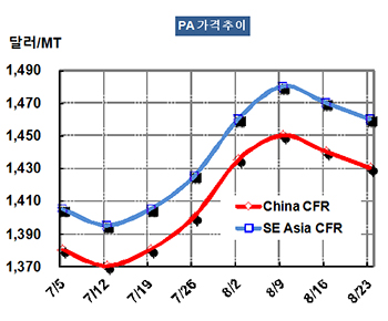 PA 가격은 8월22일 CFR China 톤당 1430달러로 10달러 하락했다.