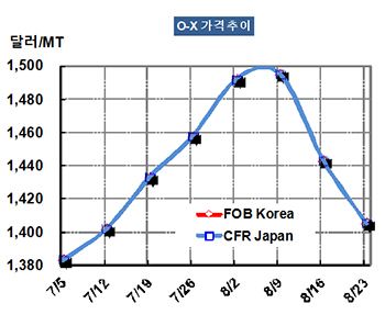 O-X 가격은 8월23일 FOB Korea 톤당 1405달러로 38달러 급락했다.