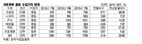 표, 그래프: < 석유화학 원료 수입가격 변화 > <화학저널 2013/09/02> |