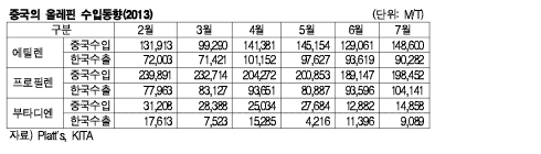 표, 그래프: < 중국의 올레핀 수입동향(2013) > <화학저널 2013/09/02> |