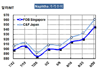 나프타 가격은 8월30일 CFR Japan 톤당 961달러로 28달러 상승했다.